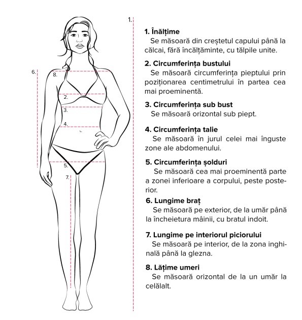 Pentru a crea ținuta potrivită/perfectă pentru tine, te rugăm să ne furnizezi măsurile solicitate. Pentru orientare, trebuie să urmezi cu exactitate desenul de mai sus. Toate dimensiunile vor fi trecute in centimetri (cm).