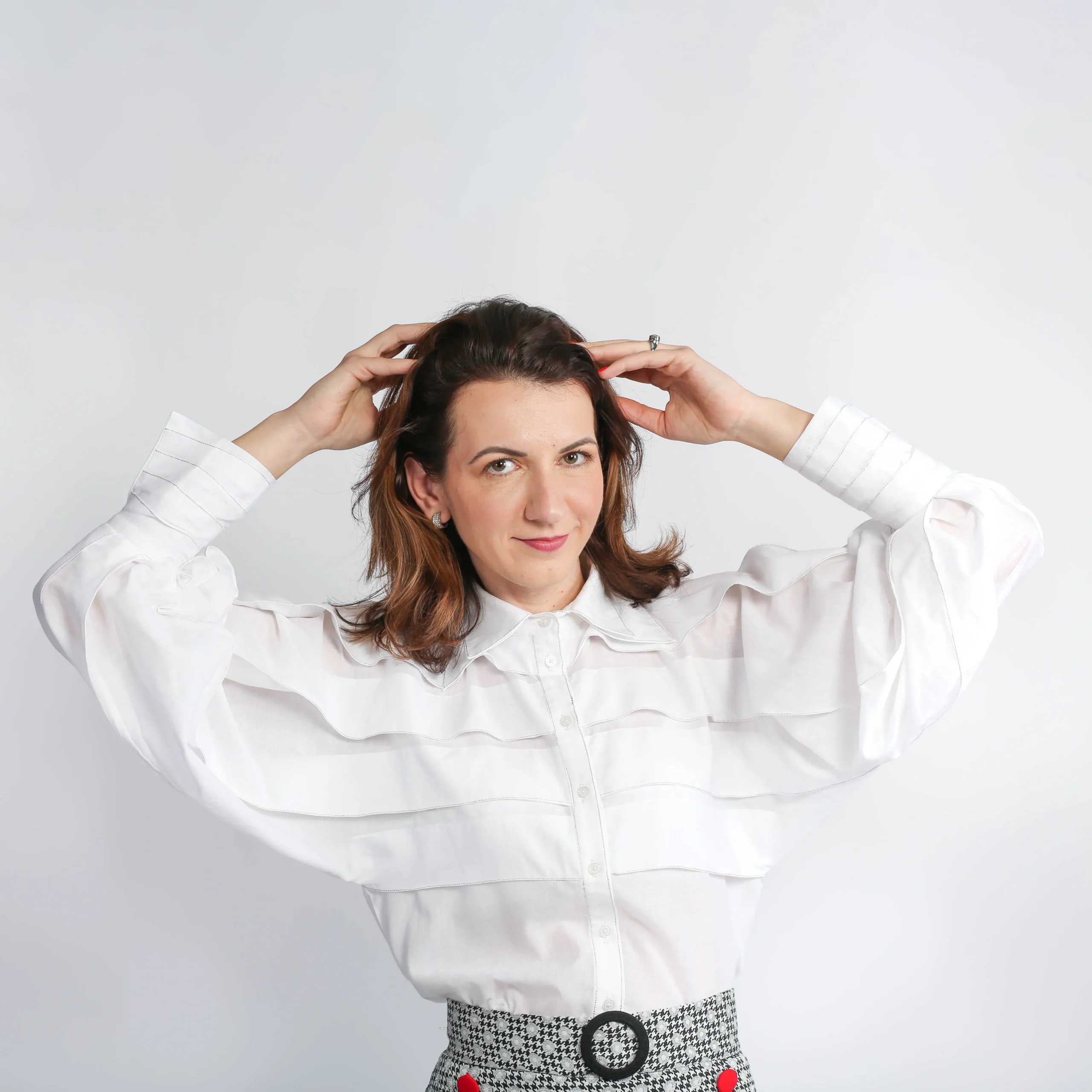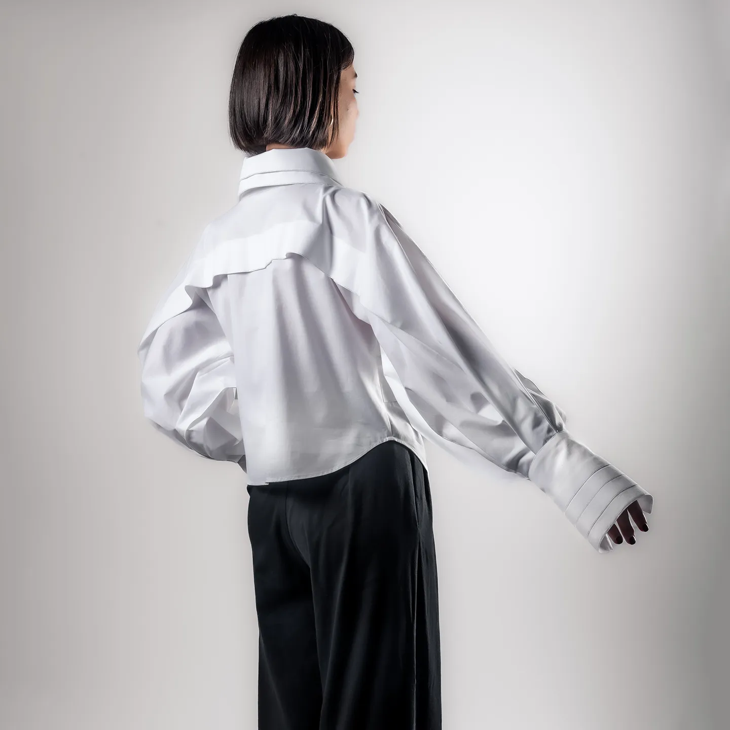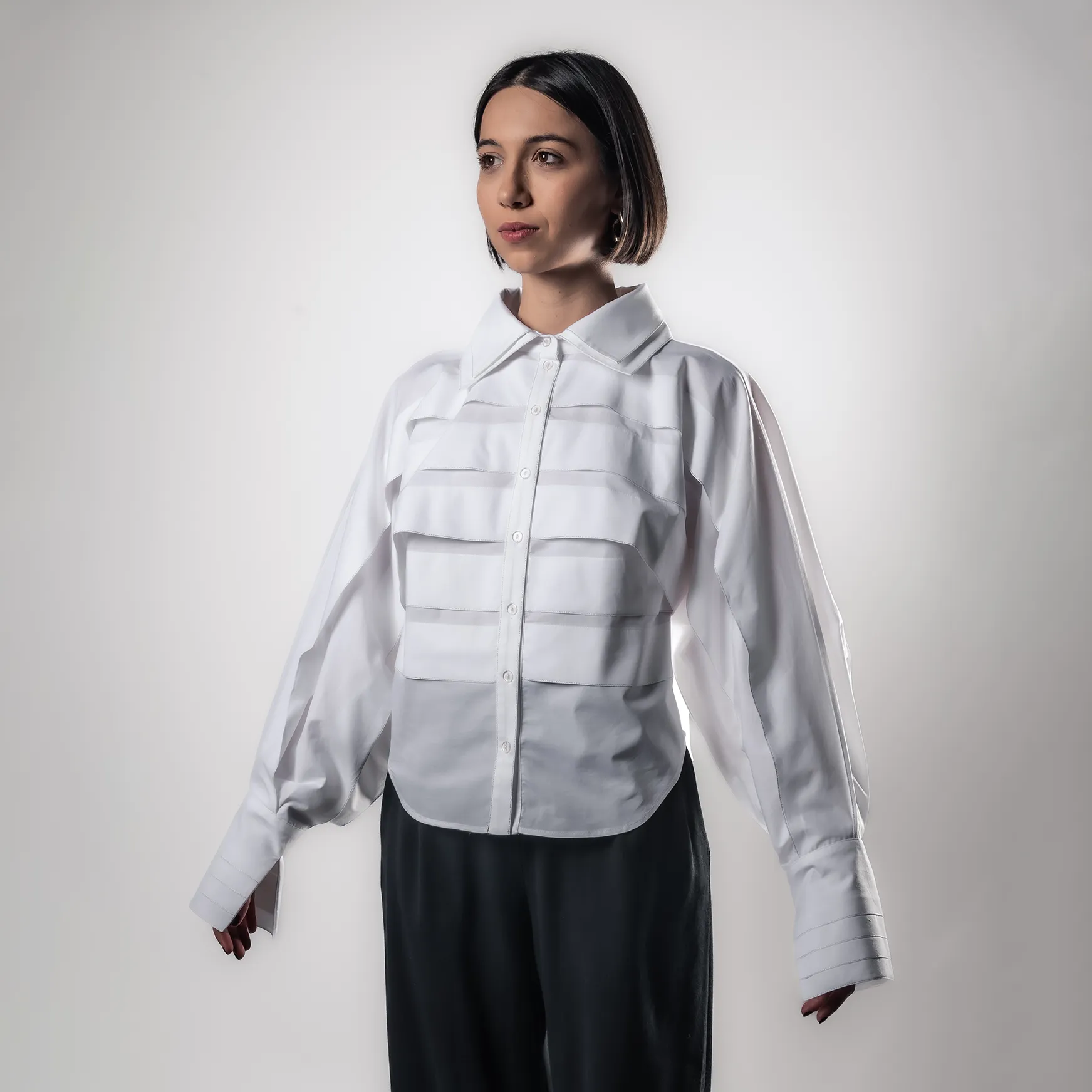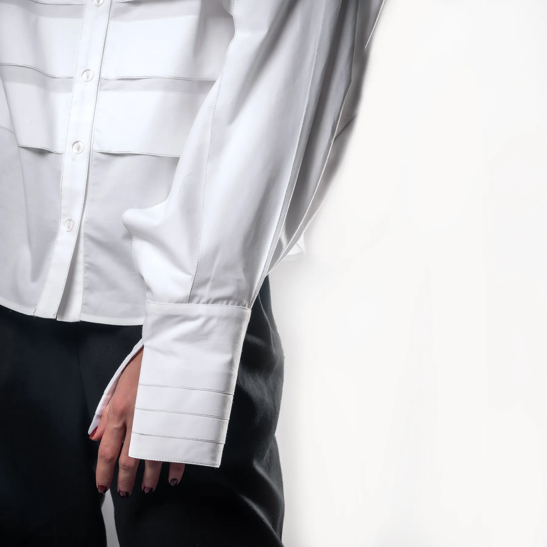 camasa alba din bumbac cu pliuri orizontale tighelite cu lame argintiu, guler dublu, manseta lata, nasturi