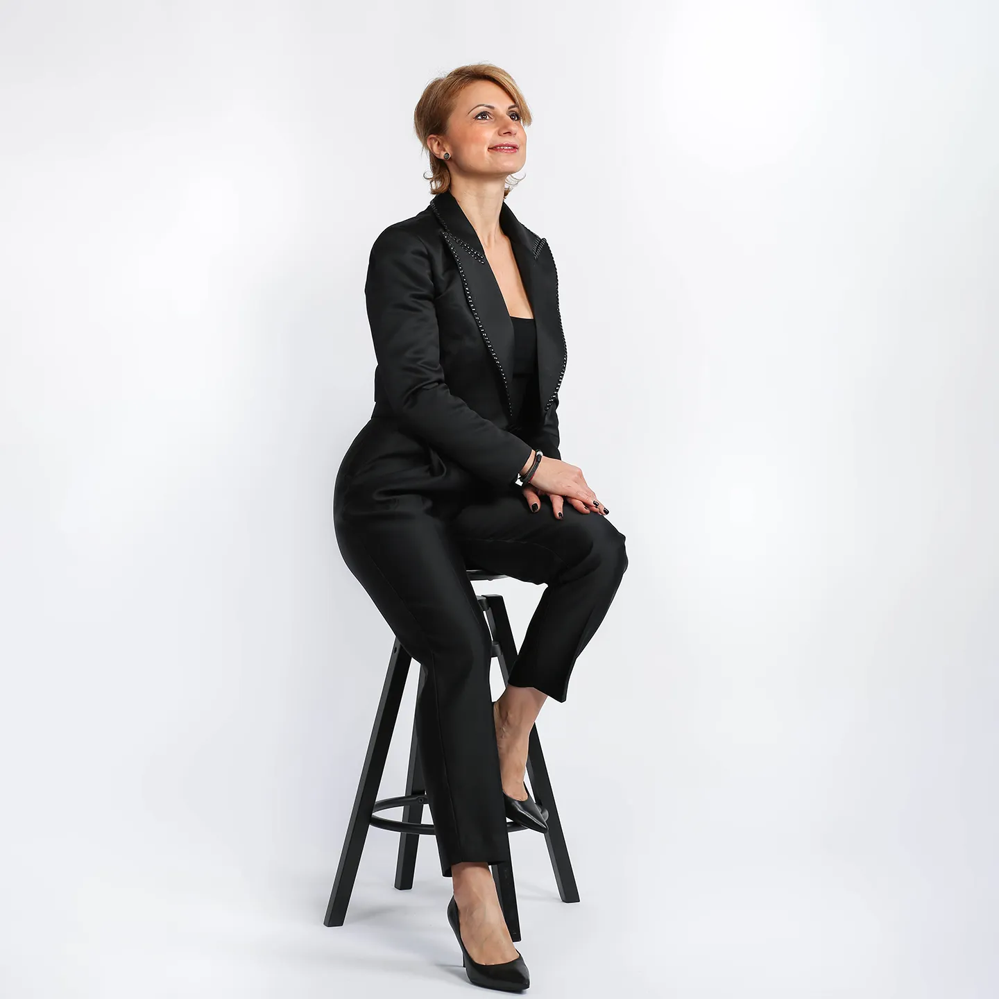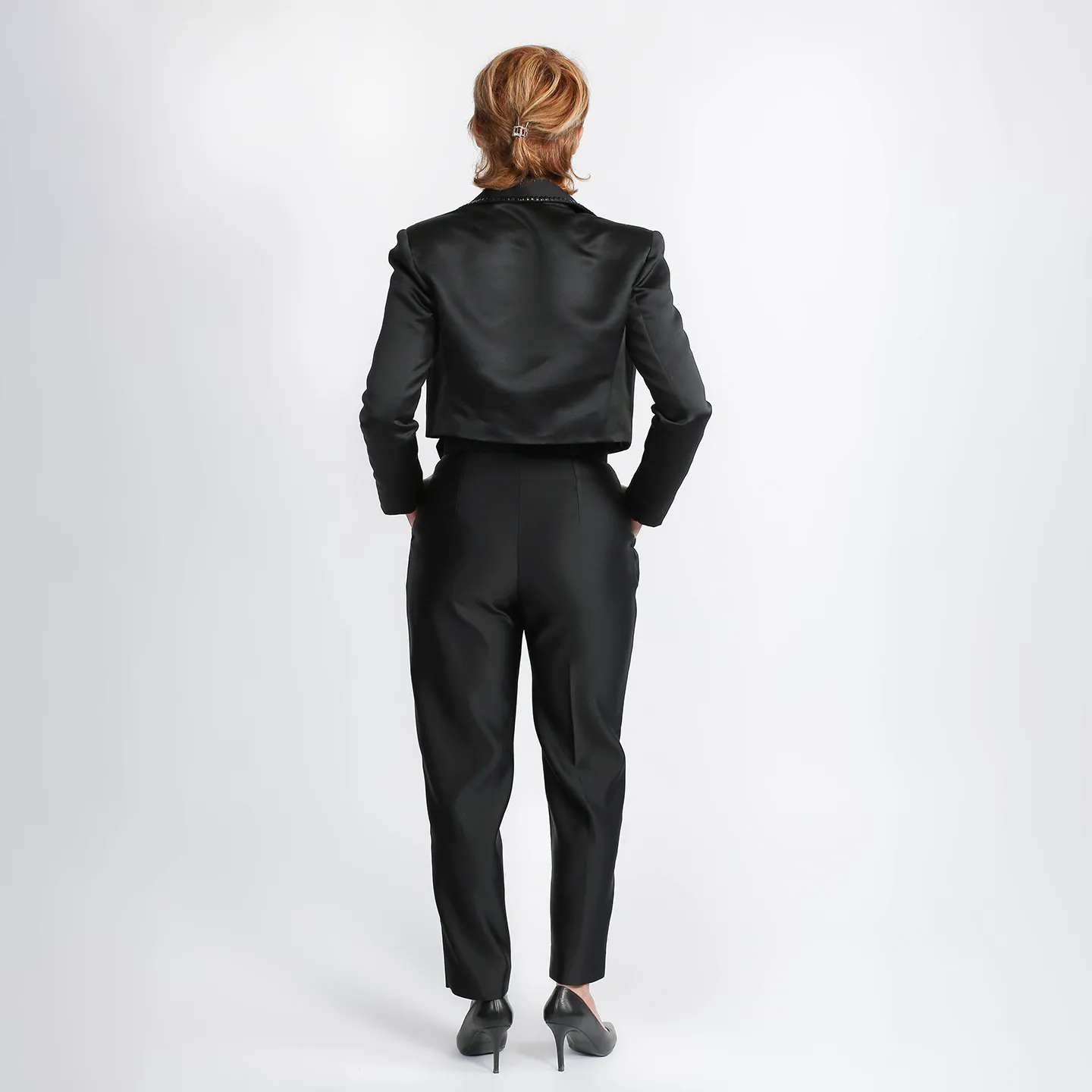 Costum negru din tafta format din blazer scurt pana in talie si rever ascutit accesorizat si pantaloni conici cu talie inalta si buzunare .