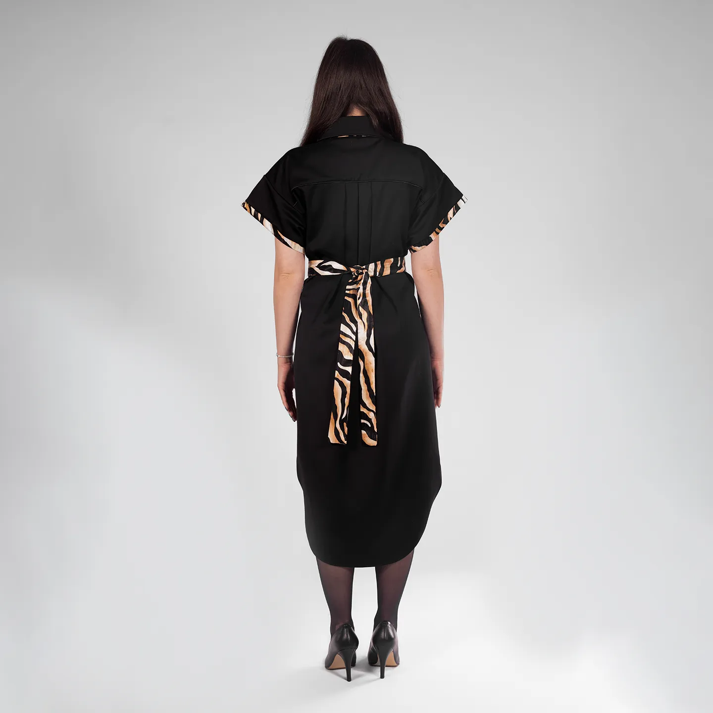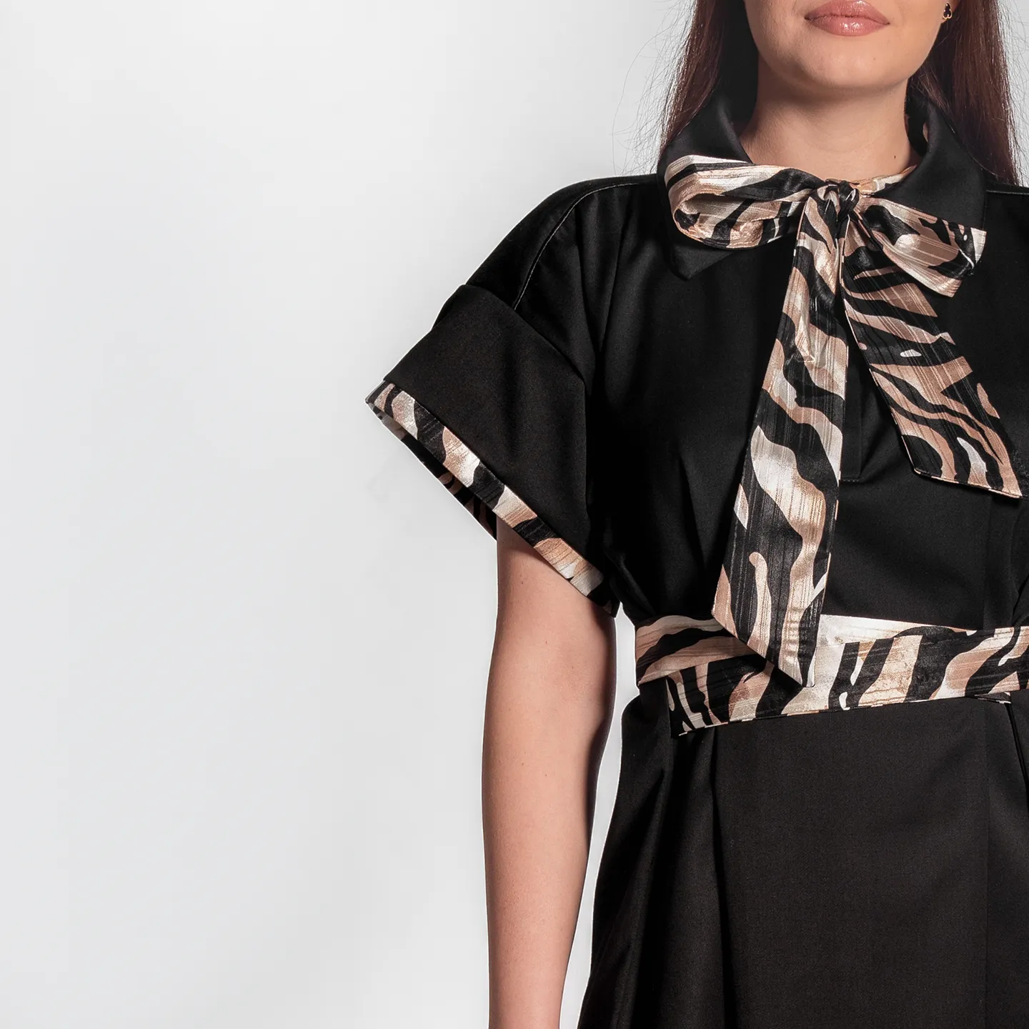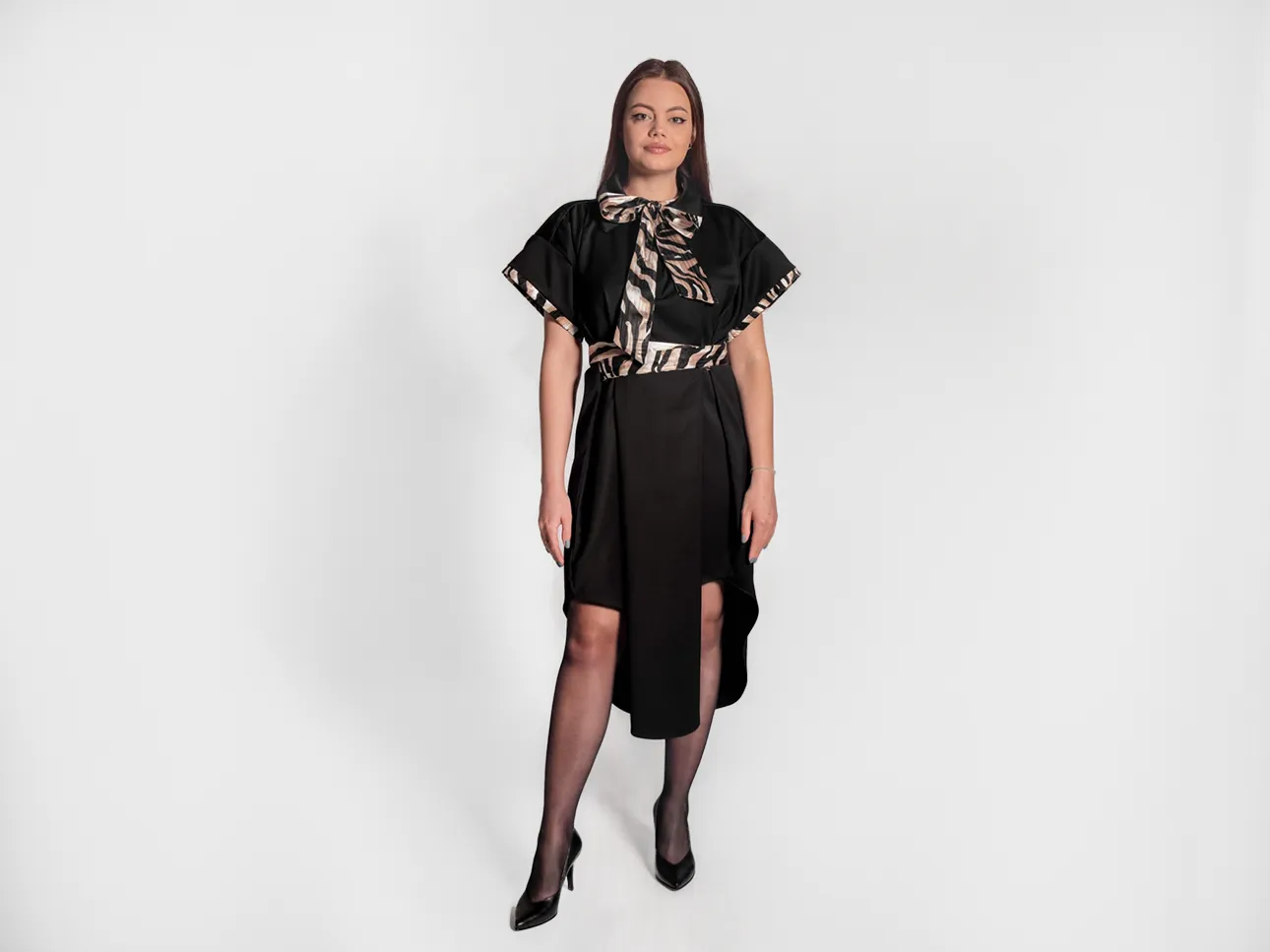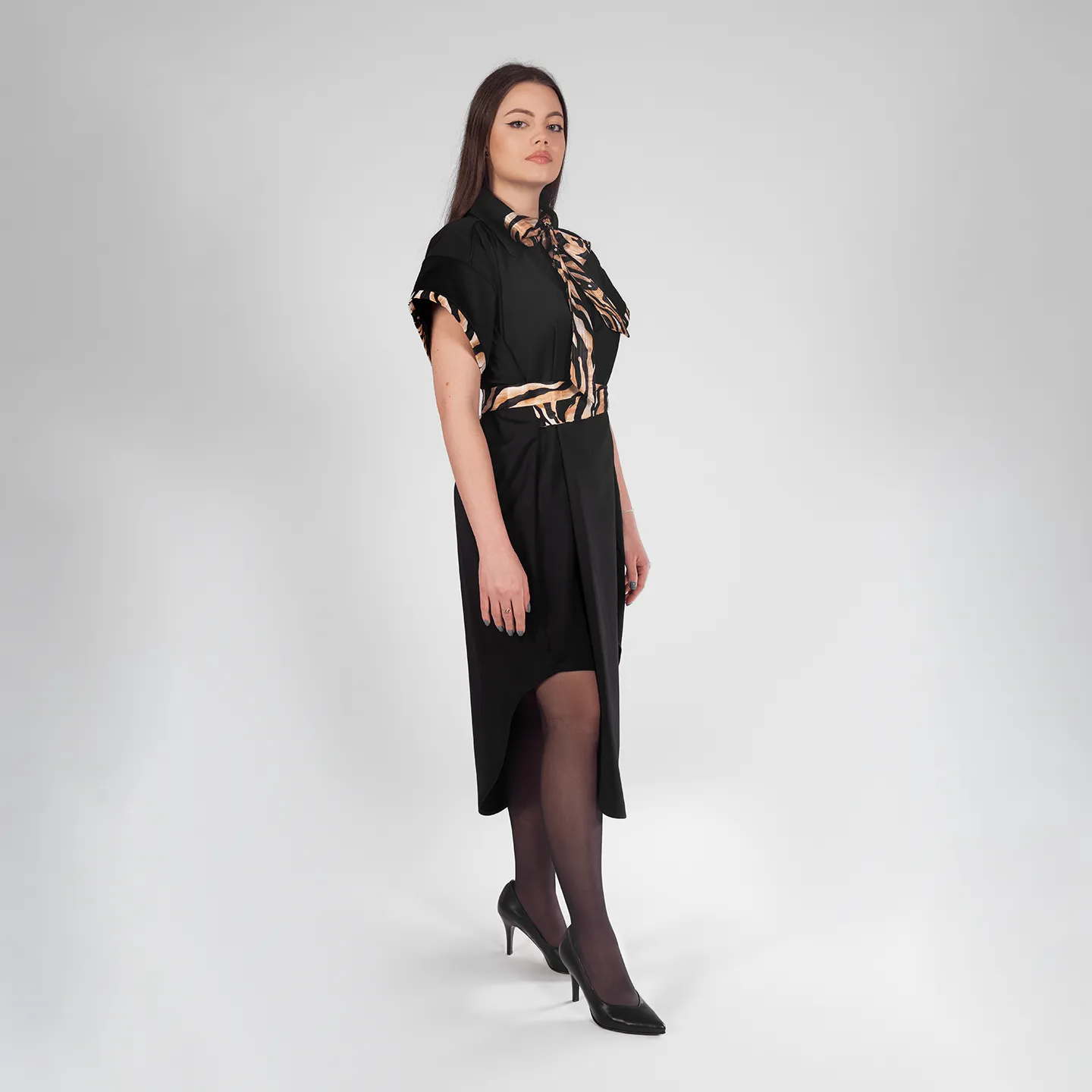Rochie neagra din stofa asimetrica cu guler si cordon in talie. ideala pentru purtat la birou