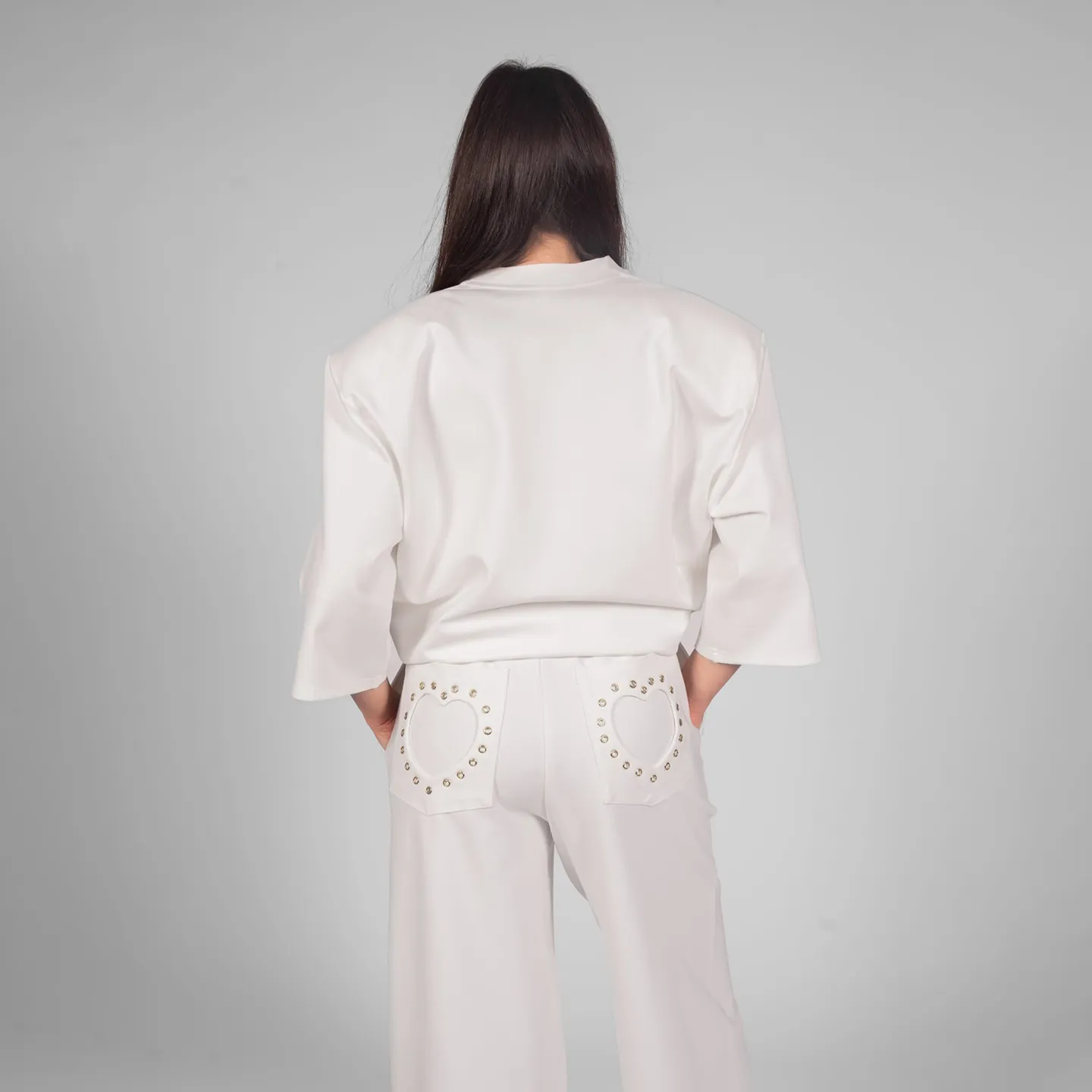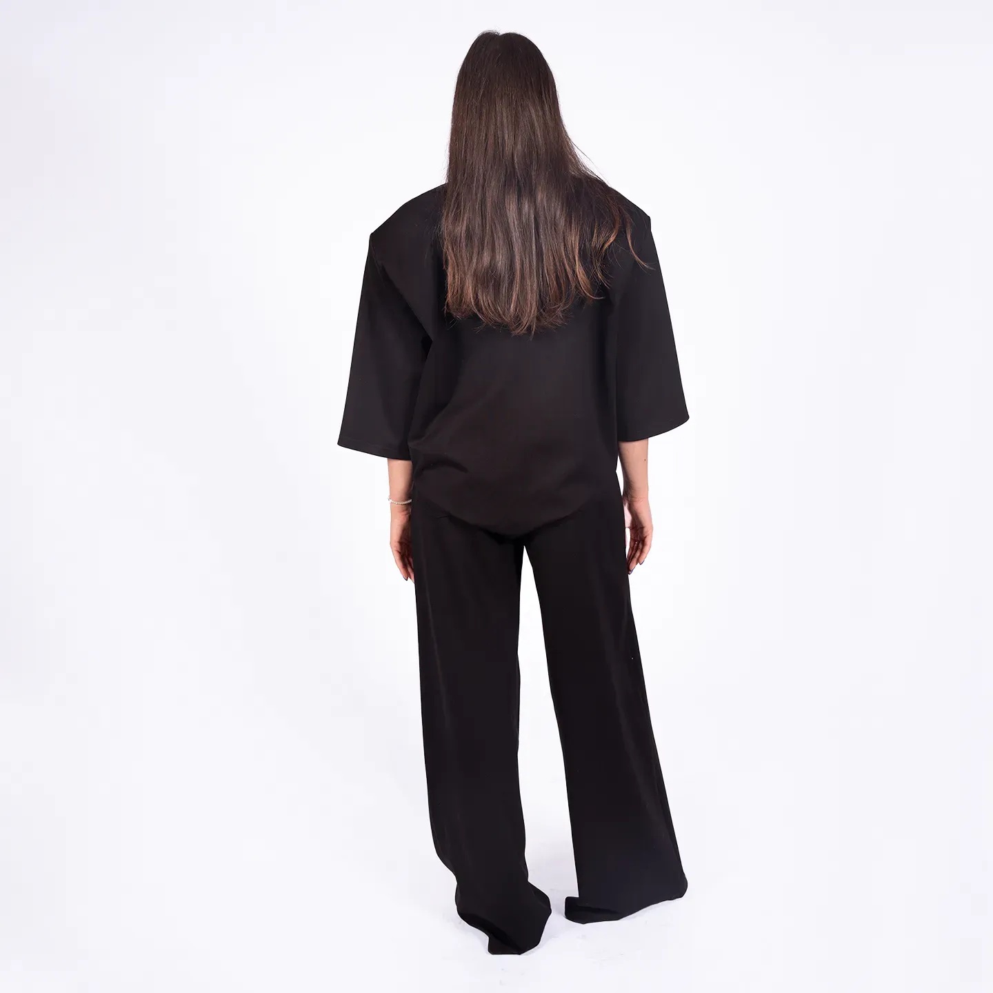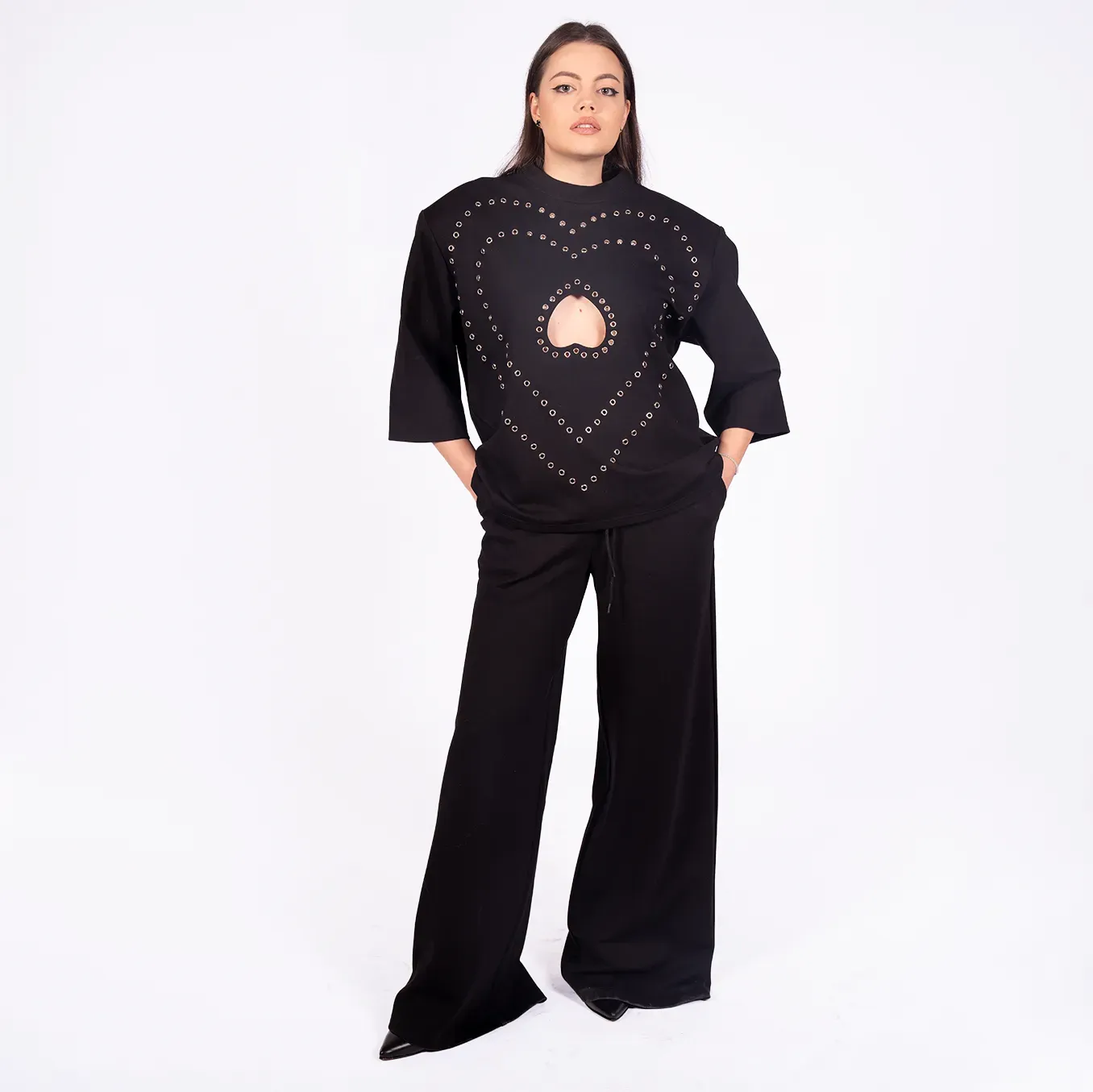 Tricou negru oversized cu decupaj în formă de inimă — confort și stil statement. Perfect pentru ținute casual sau urbane; material de foarte buna calitate și întreținere ușoară.